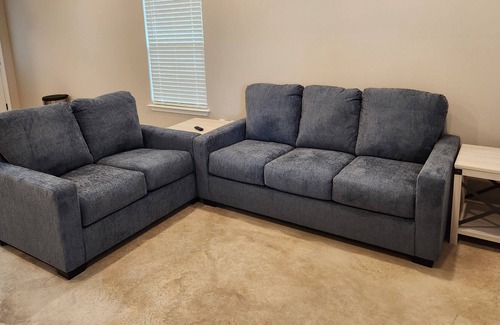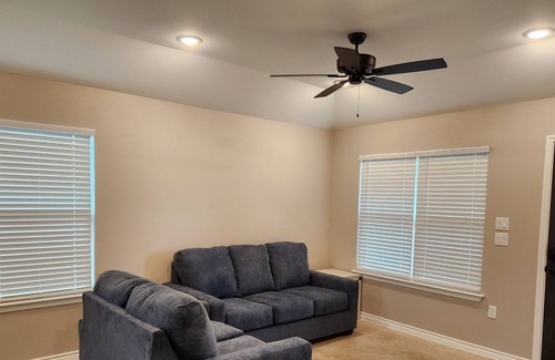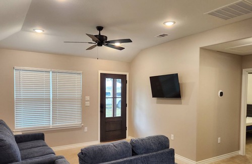 Enjoy a country getaway with your family or friend group! Relax out in nature as you take in all the sights and sounds of ranchland, farmland, and the pecan bottoms that are sprawling about the area. Grill outdoors as you walk around the beautiful property and admire the tall pecan trees. Retreat indoors to the modern-style cabin and nearby RV for a peaceful night's rest, away from the city.