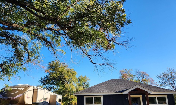 Spend time in nature on our campground set-up with a modern-style cabin and RV! | RV Rental in Lometa