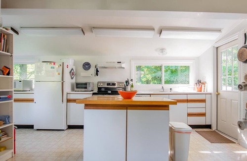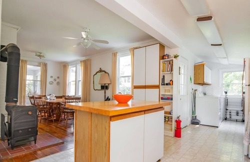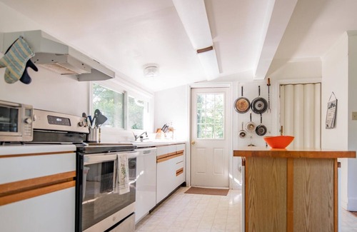 FIRST FLOOR: Open floor plan includes living room, dining room, and kitchen. Kitchen has an island with modern appliances and an adjacent laundry room. There is a small wood stove in the kitchen area that is perfect for cozy mornings. Walk out of the kitchen to a very private deck with a gas grill plus seating for 8 and a fenced backyard. A second, larger wood stove in the living room creates a cozy space with a sleep sofa and TV, DVD/VHS player. The dining room seats 8 comfortably. On the first level, the main bedroom has a king-sized bed and a large picture window for gorgeous morning views. The second bedroom has a double bed. Two full bathrooms (showers only) are on the main floor. The screened side porch is a perfect place to read on the futon or rocking chairs.