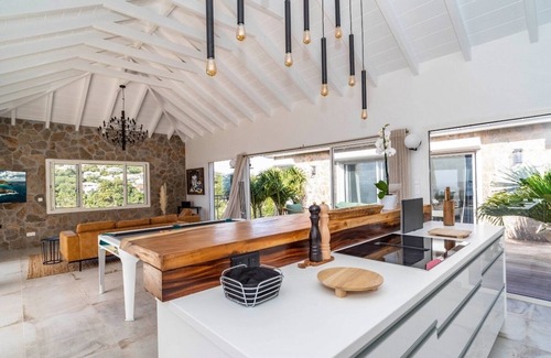 The villawas built on an original architecture featuring two buildings connected by a comfortable and fresh patio. The living room is furnished with soft sofas in warm, caramel color tones in front of the breathtaking panorama. Walls made of stone, vaulted ceilings, and refined hanging lights create a very serene atmosphere in this open-plan living room gently swept by the trade winds. This cozy living room is spacious and airy, a perfect place for relaxing sessions. You will also appreciate the pool table set up in this spacious living room for delightful evenings of gaming in front of the stunning view.
