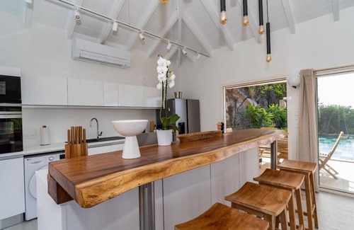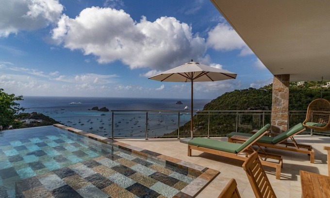 This lovely two-bedroom vacation villa is ideally located in the heights of Colombier. It offers a magnificent ocean view in an idyllic tropical environment. With a nice heated pool and a pretty patio, this luxurious villa is the perfect place for a romantic stay.