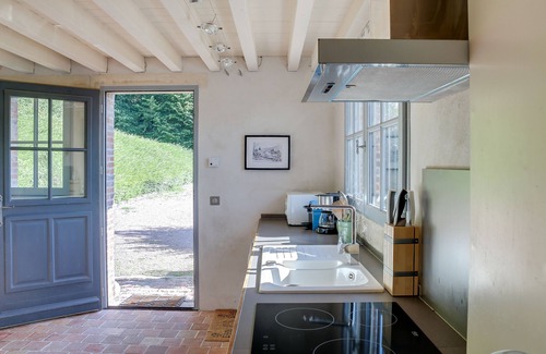 The house has been rebuilt by local craftsmen in 2012 and most of its original features have been kept. The presence of bricks and stone and the timber frame is characteristic of regional houses in Normandy. It used to be a rural building and we wanted to keep the main features. We added to it a large glass veranda that allows you to enjoy the garden and the view in any weather.