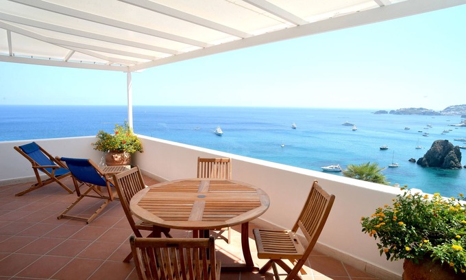 Nestled in the rock of Cala Inferno, surrounded by greenery and overlooking the sea where the white of the walls contrasts the blue of the sea and there is a splendid villa in Le Forna, just 5 kilometers from the Port of Ponza.