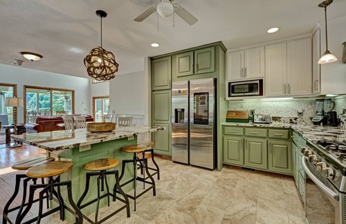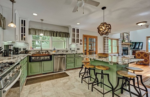 Picture yourself sitting on a spacious porch, looking down on the glistening sun-lit water of one of the most beautiful lakes in the mountains. Split Rail sits on a hill overlooking Lake Glenville, a pristine lake with 26 miles of shoreline, located just 8 miles from Cashiers. This is the highest lake in elevation east of the Mississippi River. An open floor plan with many windows allows for a ton of natural light. The kitchen has stainless steel appliances, granite countertops, and an island with seating; there is a grill on the main floor deck. In the living room, under the soaring tongue and groove ceiling, enjoy a stunning view of the lake, a fire in the large stone fireplace, while relaxing on the over-stuffed sofa. There is a large Smart TV in this room, with access to YouTube TV and other apps. The entry level guest room features a king bed and sliding glass doors to the deck overlooking the lake. An adjacent full bathroom also serves as a powder room for this floor. Upstairs offers a master bedroom with a king bed, a large Smart TV, a private bathroom with shower and jacuzzi tub, and access to a private balcony overlooking the lake. There is a large second guest room on this floor, with a king bed, a large Smart TV, and a full bath. The lower level renders another living area with a large couch that seats at least 6, a 65" Smart TV, a gas fireplace, and pool table. The lower-level bedroom has a queen bed and twin bunk beds, a TV, and uses a bathroom with a double shower. From the lower level living area, there are double French doors leading to an outside infinity deck overlooking the lake, seating area, and a hot tub. There is separate entrance to the very spacious garage apartment which has two queen sized beds, ceiling fans, a flat screen TV, and a private bath with shower/tub combination. The apartment offers sliding glass doors to the private balcony, providing natural light and a view of the lake, as well as a kitchenette with a mini fridge, sink, coffee maker, and microwave. This home also has a private dock located just a short walk down the driveway. There are 2 kayaks available. You also have use of the garage.