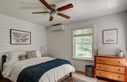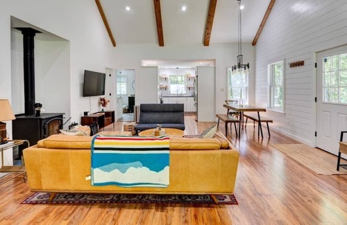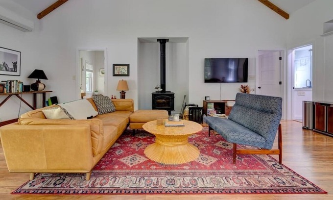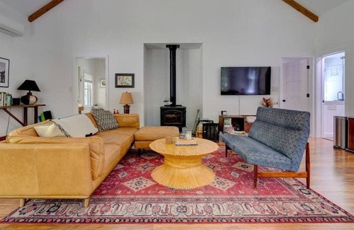 Set back on a quiet road, the house has 2 bedrooms and 1 full bath. This is a perfect remote work getaway and also great for families, friends or couples. The house features a high-end kitchen, wood-burning stove, designer furniture, a well-appointed outdoor firepit under string lights and outdoor dining.
