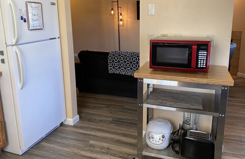 The kitchen has brand new appliances, cabinets, Keurig coffeemaker, blender, cookware, pots and pans, wine glasses, and a wine opener. There are plenty of dishes and silverware for a nice dinner or a family breakfast. You will also find coffee, tea, oil, salt, and pepper.