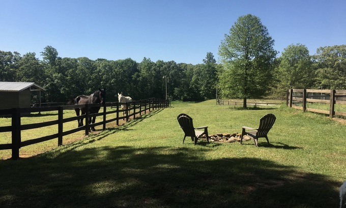 “The Don” sits nestled in shady pines but overlooks our big pasture. It’s an easy walk to the lake or woods trails. Guests are welcome to wander anywhere on the farm (except entering pastures containing animals) and visit with our wild assortment of rescue animals. Visitors are welcome to bring their horses or boats, but please give us a heads up so we know we have space during your stay. Everyone is encouraged to bring leftovers to feed the animals.