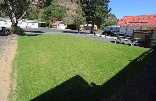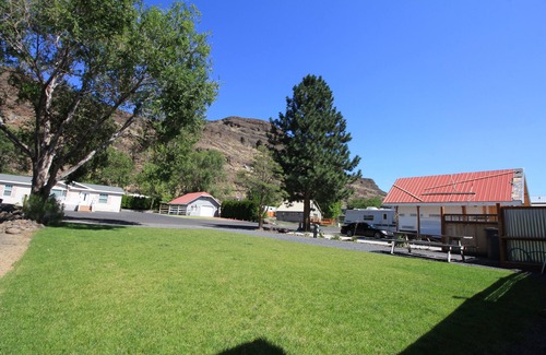 Stretch out on the giant grass lawn next to your RV while gazing at the majestic basalt cliffs that tower overhead. This site will accommodate the largest of RVs and have plenty of parking, even boat parking. Huge grass lawn and gravel area to spread out on. This site adjoins our Peterson property so for larger groups with an RV book them together. Need even more space, the Burke is right next door as well. Enjoy full water, 30 amp power and sewer on this site. Please be aware this is an RV site with no official bathroom. You must have an RV with a functioning bathroom. One extra tent is allowed. The property is located about 4 blocks from the sprawling riverfront park.