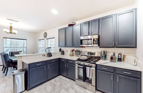 When you need a break from the heat, head into the centrally air-conditioning home where there is more than enough space for you to sprawl out and get comfortable. The home's main living room boasts plush seating and a large Smart TV. Steps from here, the full kitchen offers gleaming countertops and stainless steel appliances. The adults of the group will appreciate the den for evening cocktails and the designated work desk for remote projects.