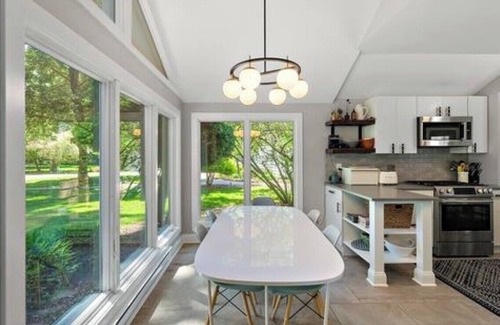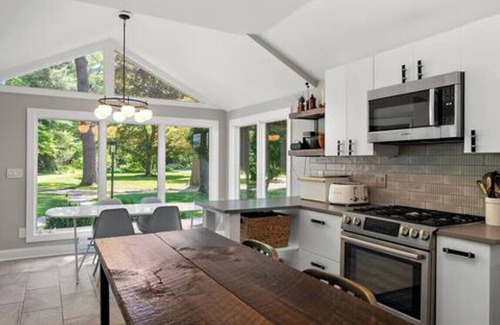 Welcome to The Rambling Hideaway — a spacious 4,500 sq. ft. ranch on 1.5 wooded acres in Union Pier. Perfect for multi-generational families and group getaways, the home features two private bedroom wings connected by expansive common areas, plus a newly renovated private pool area and multiple outdoor living zones. Sleeps up to 16 guests.