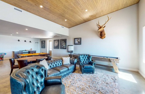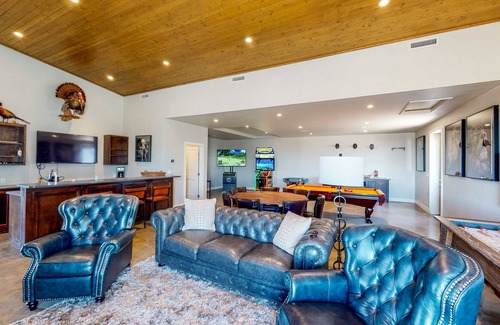 The extra building is all about entertaining! Perfect for game days, this space is adorned with ample seating, multiple gaming systems, a pool table, a full bar, and a large TV.