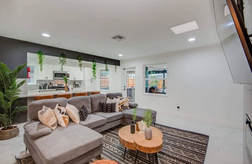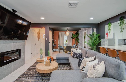 Bring your swimsuits and enjoy a refreshing dip in the outdoor swimming pool! This fully fenced backyard offers you privacy while the tropical landscaping whisks you away into vacation mode. From the fire pit to the poolside loungers to the outdoor dining area, make the most of your stay here and enjoy all the amenities provided!