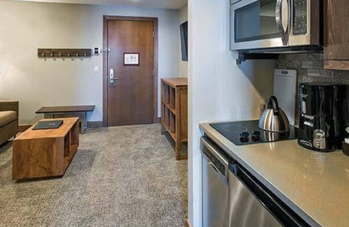The condo itself gives you complete flexibility. The unit sleeps 8 comfortably and 4 privately. It consists of a master suite and a studio suite that can be locked off for ultimate privacy, or left open completely for the whole gang. Both units have king beds in their bedrooms and sleeper sofas with queen mattresses in their living areas. The studio has its own well equipped kitchenette. The main unit offers a full sized kitchen completely equipped with literally everything but the food - so convenient when you want to "ski-in" for a quick bite to eat, or for planning a full "stay at home dinner" when you want a night in. It includes granite countertops, stainless steel appliances and bar seating, and opens up to the dining area and the living area, with its gas fireplace, balcony, and flat-screen TV. Other features include free heated underground parking, complimentary wireless internet and your own washer/dryer combo.