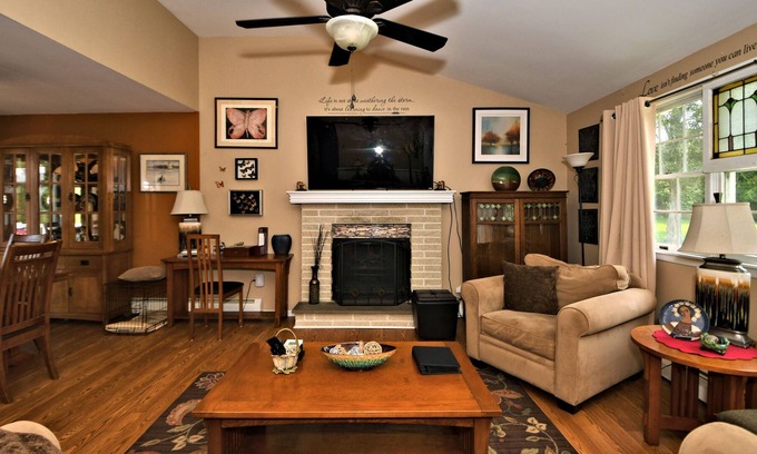 There is a Cathedral ceiling living room with a brick remote controlled electric fireplace. A Large Flat Screen TV is mounted above. No cable but there is WIFI and streaming.