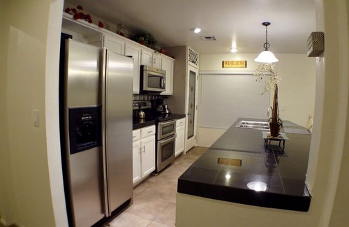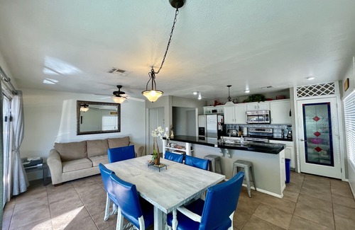 Dining seats 6 at kitchen table 2 at bar. Black granite counters, Stainless Steel Appliances and neutral tile through out home. No carpet helps for those who have allergies. Living room features 60" HD Smart TV (lots of APS) Netflix set up, DVD player Foozball Table and board games for your entertainment.
