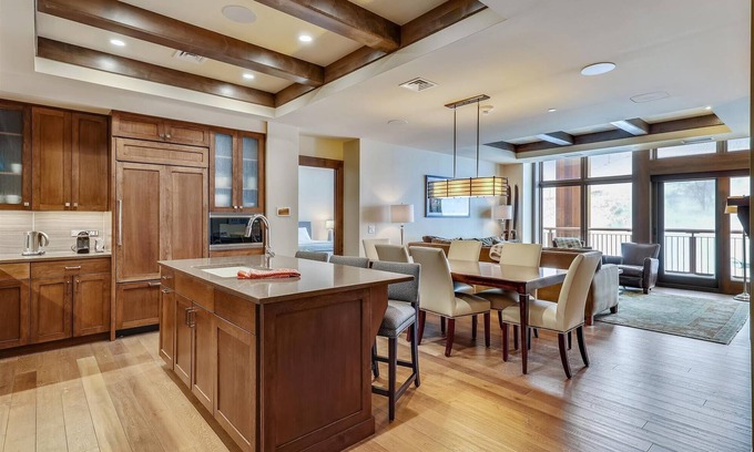 During the day, treasure the views of your children's first moments skiing on the magic carpet or on Inspiration Lane. The Children's Adventure Center ski school is located directly below the residence, providing an easy drop-off and pick-up. At night, relax in the open living area with floor to ceiling windows and a gas fireplace providing that vacation ambiance. The gourmet kitchen features high-end appliances, a large island for informal gatherings, and for a more formal dining experience, the dining room table is steps away with seating for six. And to finish a perfect day on the slopes, the residence's deck offers incredible viewing for the mountain's occasional firework shows.