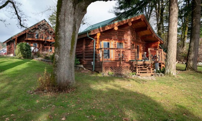 Enjoy the private hot tub for soaking, luxury linens, dish-ware, a kitchenette, a good book by the gas fireplace, jetted bathtub, stunning view of the Columbia River and high speed internet. The Spruce cabins sleeps 7 with 1 full/1 twin bed in the loft, 1 queen bed and 1 full futon in the main living area.