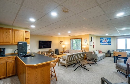 The second floor is designed for both relaxation and fun, with a loft area that includes a pool table. There are three additional bedrooms: one with a queen bed and an en suite bathroom, another with two queen beds and an en suite bathroom, and a third with two queen beds sharing a full bath. The walk-out basement offers a large rec room with a kitchenette, foosball table, and bunk room with multiple beds—perfect for kids or larger groups. A shared hall bath with a shower is conveniently located on this level.