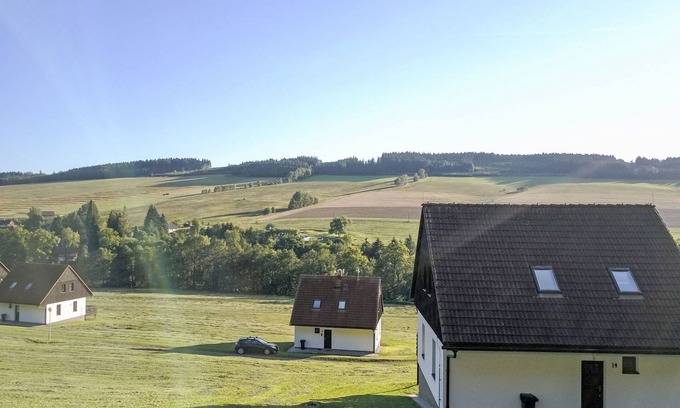 Stárkov 18 km from Náchod: Resort "Stárkov", 450 m a.s.l., semi-detached, built in 1997, surrounded by meadows. 22 houses in the resort. On the outskirts, in a sunny, elevated position on a slope, along the wooded area, 24 km from the lake, 10 km from the skiing area, in the countryside. For shared use: property 10 ha, meadow, pond, swimming pool (8 x 4 m, depth 150 cm, seasonal availability: 15.Jun. - 16.Sep.). Table tennis, volleyball, badminton, volleyball court, beach volleyball, patio, barbecue, fireplace, children's playground (slide, swing, sandbox). In the complex: reception, lounge, bistro, massage (extra). Billiard table, table football, trampoline, kiosk, storage room for bicycles, laundry (extra). Linen change (suppl. charge extra). Towel change (suppl. charge extra). Room cleaning on request (extra). Bread roll service possible on request. Pre-arrival grocery service. Motor access to 200 m from the house. Public parking. Grocery 1 km, supermarket 8 km, restaurant 1 km, café 10 m, bus stop "Stárkov,mlékárna" 280 m, railway station "Žďár nad Metují" 4.6 km, indoor swimming pool 18 km. Golf course (9 hole) 26 km, sailing school 26 km, tennis 500 m, riding stable, walking paths from the house, cycle lane 10 m, ski lift 6 km, ski school 17 km, cross country ski track 100 m, ice rink 8 km, children's playground 10 m. Nearby attractions: Adršpašsko-teplické skály 15 km, Náchod 17 km, Broumovské stěny 17 km, Ratibořice a Babiččino údolí 22 km, Broumov 24 km, Relaxpark Pec pod Sněžkou 50 km. Well-known ski regions can easily be reached: Radvanice 10 km, Petříkovice 17 km, Mladé Buky 36 km. Well-known lakes can easily be reached: vodní nádrž Rozkoš 26 km. Please note: suitable for families, suitable for seniors baby equipment on request (included). The photograph shows a typical example. All houses/apartments are individually designed/furnished.
