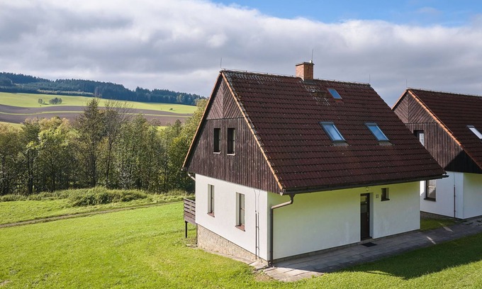 Stárkov 18 km from Náchod: Resort "Stárkov", 450 m a.s.l semi-detached, built in 1997, surrounded by meadows. 22 houses in the resort. On the outskirts, in a sunny, elevated position on a slope, along the wooded area, 24 km from the lake, 10 km from the skiing area, in the countryside. For shared use: property 10 ha, meadow, pond, swimming pool (8 x 4 m, depth 150 cm, seasonal availability: 15.Jun. - 16.Sep.). Table tennis, volleyball, badminton, volleyball court, beach volleyball, patio, barbecue, fireplace, children's playground (slide, swing, sandbox). In the complex: reception, lounge, bistro, massage (extra). Billiard table, table football, trampoline, kiosk, storage room for bicycles, laundry (extra). Linen change (suppl. charge extra). Towel change (suppl. charge extra). Room cleaning on request (extra). Bread roll service possible on request. Pre-arrival grocery service. Motor access to 200 m from the house. Parking at the house. Grocery 1 km, supermarket 8 km, restaurant 1 km, café 10 m, bus stop "Stárkov,mlékárna" 280 m, railway station "Žďár nad Metují" 4.6 km, indoor swimming pool 18 km. Golf course (9 hole) 26 km, sailing school 26 km, tennis 500 m, riding stable, walking paths from the house, cycle lane 10 m, ski lift 6 km, ski school 17 km, cross country ski track 100 m, ice rink 8 km, children's playground 10 m. Nearby attractions: Adršpašsko-teplické skály 15 km, Náchod 17 km, Broumovské stěny 17 km, Ratibořice a Babiččino údolí 22 km, Broumov 24 km, Relaxpark Pec pod Sněžkou 50 km. Well-known ski regions can easily be reached: Radvanice 10 km, Petříkovice 17 km, Mladé Buky 36 km. Well-known lakes can easily be reached: vodní nádrž Rozkoš 26 km. Please note: suitable for families, suitable for seniors baby equipment on request (included).