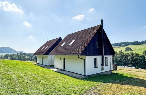 Stárkov 18 km from Náchod: Resort "Stárkov", 450 m a.s.l semi-detached, built in 1997, surrounded by meadows. 22 houses in the resort. On the outskirts, in a sunny, elevated position on a slope, along the wooded area, 24 km from the lake, 10 km from the skiing area, in the countryside. For shared use: property 10 ha, meadow, pond, swimming pool (8 x 4 m, depth 150 cm, seasonal availability: 15.Jun. - 16.Sep.). Table tennis, volleyball, badminton, volleyball court, beach volleyball, patio, barbecue, fireplace, children's playground (slide, swing, sandbox). In the complex: reception, lounge, bistro, massage (extra). Billiard table, table football, trampoline, kiosk, storage room for bicycles, laundry (extra). Linen change (suppl. charge extra). Towel change (suppl. charge extra). Room cleaning on request (extra). Bread roll service possible on request. Pre-arrival grocery service. Motor access to 200 m from the house. Parking at the house. Grocery 1 km, supermarket 8 km, restaurant 1 km, café 10 m, bus stop "Stárkov,mlékárna" 280 m, railway station "Žďár nad Metují" 4.6 km, indoor swimming pool 18 km. Golf course (9 hole) 26 km, sailing school 26 km, tennis 500 m, riding stable, walking paths from the house, cycle lane 10 m, ski lift 6 km, ski school 17 km, cross country ski track 100 m, ice rink 8 km, children's playground 10 m. Nearby attractions: Adršpašsko-teplické skály 15 km, Náchod 17 km, Broumovské stěny 17 km, Ratibořice a Babiččino údolí 22 km, Broumov 24 km, Relaxpark Pec pod Sněžkou 50 km. Well-known ski regions can easily be reached: Radvanice 10 km, Petříkovice 17 km, Mladé Buky 36 km. Well-known lakes can easily be reached: vodní nádrž Rozkoš 26 km. Please note: suitable for families, suitable for seniors baby equipment on request (included). The photograph shows a typical example. All houses/apartments are individually designed/furnished.