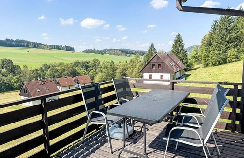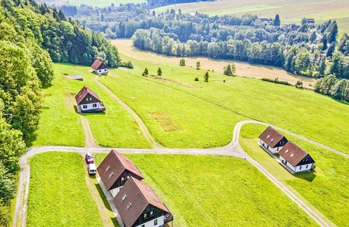 Stárkov 18 km from Náchod: Resort "Stárkov", 450 m a.s.l., semi-detached, built in 1997, surrounded by meadows. 22 houses in the resort. On the outskirts, in a sunny, elevated position on a slope, along the wooded area, 24 km from the lake, 10 km from the skiing area, in the countryside. For shared use: property 10 ha, meadow, pond, swimming pool (8 x 4 m, depth 150 cm, seasonal availability: 15.Jun. - 16.Sep.). Table tennis, volleyball, badminton, volleyball court, beach volleyball, patio, barbecue, fireplace, children's playground (slide, swing, sandbox). In the complex: reception, lounge, bistro, massage (extra). Billiard table, table football, trampoline, kiosk, storage room for bicycles, laundry (extra). Linen change (suppl. charge extra). Towel change (suppl. charge extra). Room cleaning on request (extra). Bread roll service possible on request. Pre-arrival grocery service. Motor access to 200 m from the house. Parking at the house. Grocery 1 km, supermarket 8 km, restaurant 1 km, café 10 m, bus stop "Stárkov,mlékárna" 280 m, railway station "Žďár nad Metují" 4.6 km, indoor swimming pool 18 km. Golf course (9 hole) 26 km, sailing school 26 km, tennis 500 m, riding stable, walking paths from the house, cycle lane 10 m, ski lift 6 km, ski school 17 km, cross country ski track 100 m, ice rink 8 km, children's playground 10 m. Nearby attractions: Adršpašsko-teplické skály 15 km, Náchod 17 km, Broumovské stěny 17 km, Ratibořice a Babiččino údolí 22 km, Broumov 24 km, Relaxpark Pec pod Sněžkou 50 km. Well-known ski regions can easily be reached: Radvanice 10 km, Petříkovice 17 km, Mladé Buky 36 km. Well-known lakes can easily be reached: vodní nádrž Rozkoš 26 km. Please note: suitable for families, suitable for seniors baby equipment on request (included). The photograph shows a typical example. All houses/apartments are individually designed/furnished.
