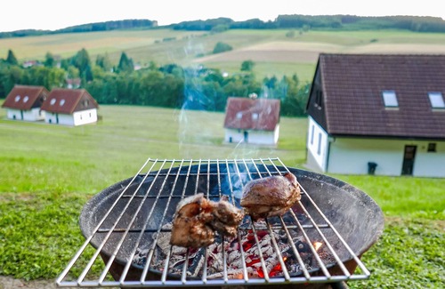 Stárkov 18 km from Náchod: Resort "Stárkov", 450 m a.s.l semi-detached, built in 1997, surrounded by meadows. 22 houses in the resort. On the outskirts, in a sunny, elevated position on a slope, along the wooded area, 24 km from the lake, 10 km from the skiing area, in the countryside. For shared use: property 10 ha, meadow, pond, swimming pool (8 x 4 m, depth 150 cm, seasonal availability: 15.Jun. - 16.Sep.). Table tennis, volleyball, badminton, volleyball court, beach volleyball, patio, barbecue, fireplace, children's playground (slide, swing, sandbox). In the complex: reception, lounge, bistro, massage (extra). Billiard table, table football, trampoline, kiosk, storage room for bicycles, laundry (extra). Linen change (suppl. charge extra). Towel change (suppl. charge extra). Room cleaning on request (extra). Bread roll service possible on request. Pre-arrival grocery service. Motor access to 200 m from the house. Public parking. Grocery 1 km, supermarket 8 km, restaurant 1 km, café 10 m, bus stop "Stárkov,mlékárna" 280 m, railway station "Žďár nad Metují" 4.6 km, indoor swimming pool 18 km. Golf course (9 hole) 26 km, sailing school 26 km, tennis 500 m, riding stable, walking paths from the house, cycle lane 10 m, ski lift 6 km, ski school 17 km, cross country ski track 100 m, ice rink 8 km, children's playground 10 m. Nearby attractions: Adršpašsko-teplické skály 15 km, Náchod 17 km, Broumovské stěny 17 km, Ratibořice a Babiččino údolí 22 km, Broumov 24 km, Relaxpark Pec pod Sněžkou 50 km. Well-known ski regions can easily be reached: Radvanice 10 km, Petříkovice 17 km, Mladé Buky 36 km. Well-known lakes can easily be reached: vodní nádrž Rozkoš 26 km. Please note: suitable for families, suitable for seniors baby equipment on request (included). The photograph shows a typical example. All houses/apartments are individually designed/furnished.