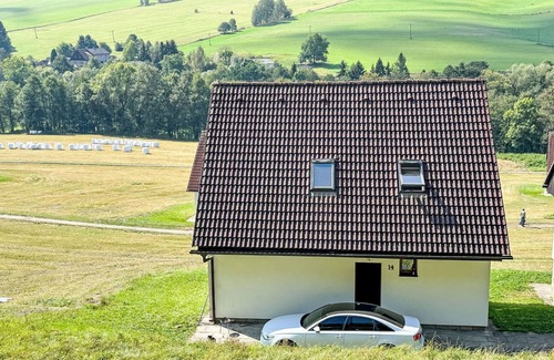 Stárkov 18 km from Náchod: Resort "Stárkov", 450 m a.s.l., semi-detached, built in 1997, surrounded by meadows. 22 houses in the resort. On the outskirts, in a sunny, elevated position on a slope, along the wooded area, 24 km from the lake, 10 km from the skiing area, in the countryside. For shared use: property 10 ha, meadow, pond, swimming pool (8 x 4 m, depth 150 cm, seasonal availability: 15.Jun. - 16.Sep.). Table tennis, volleyball, badminton, volleyball court, beach volleyball, patio, barbecue, fireplace, children's playground (slide, swing, sandbox). In the complex: reception, lounge, bistro, massage (extra). Billiard table, table football, trampoline, kiosk, storage room for bicycles, laundry (extra). Linen change (suppl. charge extra). Towel change (suppl. charge extra). Room cleaning on request (extra). Bread roll service possible on request. Pre-arrival grocery service. Motor access to 200 m from the house. Public parking. Grocery 1 km, supermarket 8 km, restaurant 1 km, café 10 m, bus stop "Stárkov,mlékárna" 280 m, railway station "Žďár nad Metují" 4.6 km, indoor swimming pool 18 km. Golf course (9 hole) 26 km, sailing school 26 km, tennis 500 m, riding stable, walking paths from the house, cycle lane 10 m, ski lift 6 km, ski school 17 km, cross country ski track 100 m, ice rink 8 km, children's playground 10 m. Nearby attractions: Adršpašsko-teplické skály 15 km, Náchod 17 km, Broumovské stěny 17 km, Ratibořice a Babiččino údolí 22 km, Broumov 24 km, Relaxpark Pec pod Sněžkou 50 km. Well-known ski regions can easily be reached: Radvanice 10 km, Petříkovice 17 km, Mladé Buky 36 km. Well-known lakes can easily be reached: vodní nádrž Rozkoš 26 km. Please note: suitable for families, suitable for seniors baby equipment on request (included). The photograph shows a typical example. All houses/apartments are individually designed/furnished.