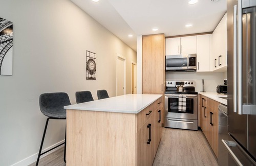 The ultramodern kitchen contains high-end stainless steel appliances, Quartz countertops, and all essential cookware. A Keurig is provided with refillable pods and coffee for your daily morning coffee!