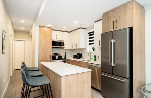 The ultramodern kitchen contains high-end stainless steel appliances, Quartz countertops, and all essential cookware. A Keurig is provided with refillable pods and coffee for your daily morning coffee!