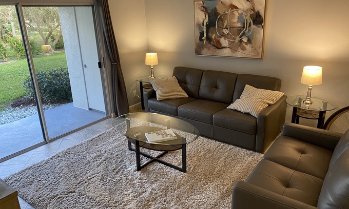 This beautiful non-smoking 2 bedroom, 2 bathroom condo, we call Bahia155, is located on the first floor with tile flooring throughout. It's exactly the space you need for convenience, relaxation and cleanliness. Walk out the sliding glass door to overlook the 6th tee box of Isla del Sol Yacht and Country Club and only sixty steps from the heated pool and hot tub.