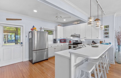 In the fully stocked kitchen, you'll find everything you need to whip up delectable meals, from the stove and oven to the refrigerator, grill, and dishwasher. Savor your creations at the dining table, surrounded by the comforts of home. When it's time to unwind, step outside to the porch or gather around the fire pit for a cozy evening under the stars.