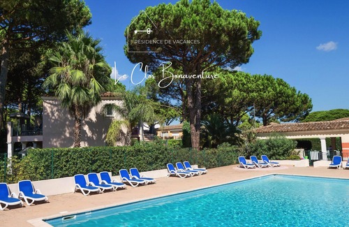 In a small, quiet residence with swimming pool in the shade of pine trees, you will be 1.4 km from the famous port of St Tropez and 500 meters from the fine sand beach "La Bouillabaisse".