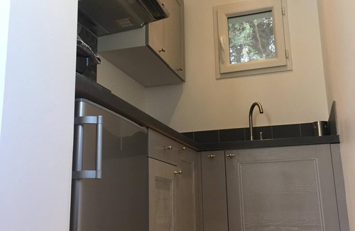 an equipped kitchen: including a TOP fridge, an extractor hood, a hob, a microwave, small appliances and crockery for 2 people.
