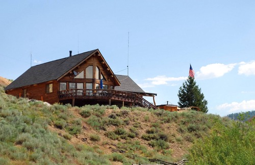 This beautiful 4,000 SF custom-built log home is perched on the hillside overlooking Stanley with unobstructed panoramic Sawtooth Mountain views. The large picture windows allow you to enjoy the majesty of the mountains with a wrap-around deck providing plenty of outdoor furniture places to enjoy your meals after barbecuing on the propane barbecue, or lounge and take in the views. The hot tub on the front deck provides the perfect place to soak as you gaze at the stars.