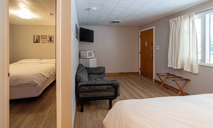 Room 10 at the Star Gate Motel is 2 a bedroom with one Queen in each room and a small sofa that rolls out to a twin bed.