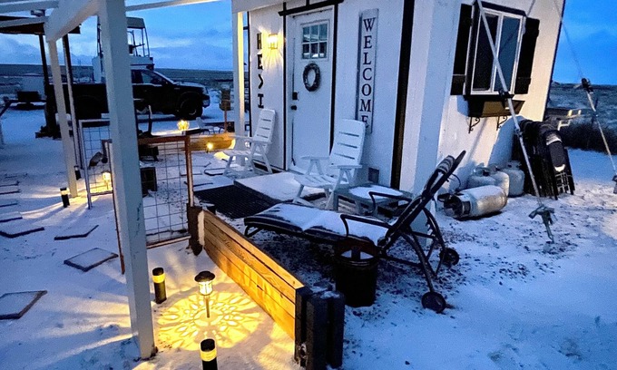 This is an adorable 10x10 non-insulated shed/cabin. Overlooking The Petrified Forest National Park plateaus to the southeast. Comes with one bunk bed with star gazing glass roof window. Includes sofa bed, refrigerator, coffee Kurig counter top machine with cabinet storage for dishes, pots, pans and utensils. You can also enjoy an indoor wood burning stove or a Portable Buddy heater and a two burner Coleman stove with propane tank. Cabin has hot and cold running water indoor sink and outdoor shower. We provide a double cartridge toilet just outside cabin.