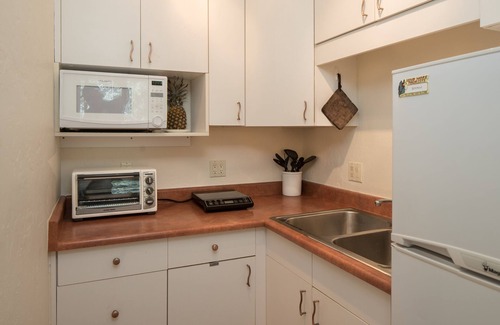 The fully stocked sunken galley kitchen is equipped with an induction cooktop, microwave, toaster oven, Mr. Coffee, Keurig, electric kettle, and a selection of coffee pods, teas, and condiments; everything you need for effortless meal prep.