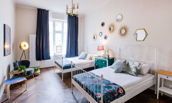 The apartment is 80 m2, it is located near the Main Market, the bus and tram stop is 5 min walking distance. 3 bedrooms with 5 double beds and 2 bathrooms.