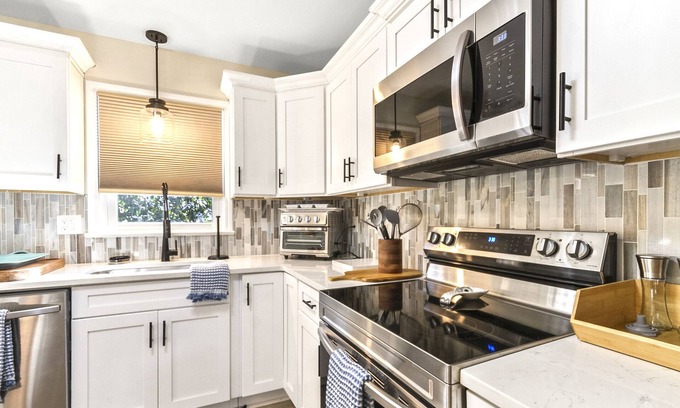 Our private tree shaded backyard, with deck, and ground level fire pit area just invites lingering over dinner with a little music, great conversation, chirping crickets, the hooting of our resident owl, and lots of memory making. The fire pit area includes a propane fire pit with sparkling glass, as well as a wood fire pit for s'mores. A propane Weber grill on the kitchen deck is super convenient to serving dinner in the spacious dining room--where more memories are sure to be made over great conversation or fun games. Everything in the kitchen is brand new and ready for your fun times! Our oversized 2 car garage is available to you, along with plenty of parking along the driveway. There is room to turn around when exiting the property. You will have the entire home, including the oversized garage for your use during your stay.