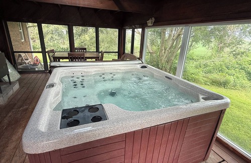 enclosed deck which has the hot tub and an outdoor dining table. If there are mobility concerns,
