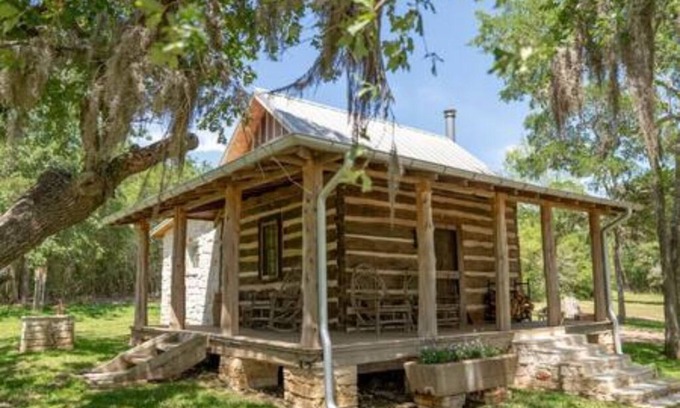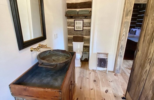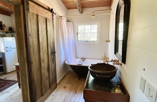 This unique 1900s-era cabin was relocated to StarHill Farms from nearby Galle Lane. Henry Bader and his family were the original occupants and all five family members lived in this cabin until the last member of their family, Eddie Bader. Fully restored using reclaimed wood, custom fixtures, and beautiful antiques. Several furniture pieces were part of the Bader family. The original main room hosts one king-size bed and a sitting/living room area combined including a wood-burning stove. Separate full-size kitchen with stove. • One room with One King-Size Bed, Sitting Area • Kitchen with stove and oven, refrigerator, coffee maker, dishes, pots and pans • Full Bathroom with Claw Foot Tub/Shower • Wood-burning stove • Central Air and Heat • All Linens • Hairdryer • Texas Lavender bath products • Covered Porch with Chairs • Small outdoor fire pit • Charcoal grill • Horseback Riding Rentals with Advanced Notice • Hiking trails