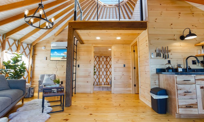 Escape to quaint luxury in our extravagant yurt retreat! A sturdy structured deck surrounds this amazing, round space that houses everything you need for a RELAXING and rejuvenating vacation. A full kitchen, a sleeping area, living room space, and more! Nestled in nature, our cozy yurt offers a unique short-term rental experience complete with a crackling firepit for evening gatherings and a bubbling hot tub for ultimate relaxation under the stars. Brew a hot cup of coffee and settle into one of the decks cozy sitting spots to enjoy your morning as nature slowly wakes up around you, then take a stroll to the firewood shed to collect wood for a crackling fire that evening. Enjoy sunset colors from your private deck, soak in the hot tub, and more at this amazing retreat space! Immerse yourself in tranquility and enjoy the perfect blend of comfort and adventure.