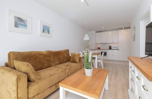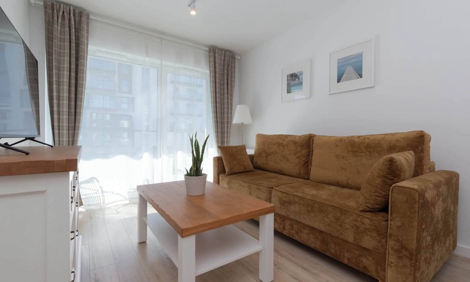 The apartment is fully equipped and can comfortably accommodate up to 4 people. The interior has been decorated in a modern style with great attention to detail, dominated by bright colors, which, combined with carefully selected equipment, create an atmosphere of peace and comfort. This color scheme makes the space not only elegant, but also exceptionally pleasant for everyday relaxation, which emphasizes the high standard of the apartment. The layout of the rooms includes a spacious living room with a kitchenette, a comfortable bedroom and a bathroom with a shower. The living room has a comfortable, fold-out sofa, which provides an additional place to sleep, a modern flat-screen TV, a coffee table and a dining table with chairs, creating an ideal place for shared meals. Large windows provide access to natural light and lead to a sunny balcony with a set of furniture, ideal for morning coffee or evening relaxation. The kitchenette has been designed with functionality and aesthetics in mind. It has an induction hob, oven and dishwasher, and elegant white fronts combined with a wooden countertop emphasize the modern character of the space. The bedroom is equipped with a stylish, fold-out sofa in olive color and a large, white wardrobe with a mirror front, which not only offers a lot of storage space, but also optically enlarges the space and adds lightness to it. Bright walls and delicate decorations introduce an atmosphere of peace and harmony, ideal for relaxation. The bathroom has a spacious shower cabin with glass doors, a modern sink with a cabinet, a large mirror and a washing machine, all of which ensures full comfort even during a longer stay.
