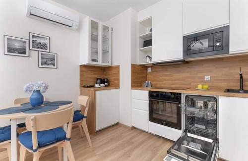 The apartment is located on the 12th floor of the building and can accommodate 4 people - an ideal option for families or friends traveling together. The highly functional 35 m² space consists of a living room with a kitchenette, a bedroom and a bathroom with a shower cubicle. The living area, equipped with a comfortable sofa and a TV with cable channels and Smart TV function, is the perfect place to relax. There is also a balcony with garden furniture, where guests can enjoy a sip of morning coffee or relax after a day of sightseeing. From here you have a view of the estate's surroundings, and you can see the sea in the isthmus between the blocks. The separate bedroom is decorated in a stylish color scheme and offers two single beds combined into a double bed and a large, capacious closet. The apartment has access to high-speed free Wifi, as well as a desk with a chair, so guests working remotely will be able to take care of business duties in comfort. A wide range of amenities and comprehensive furnishings of the apartment with necessary kitchen and bathroom accessories and equipment guarantee a comfortable stay. Guests are welcomed with a special set of complimentary toiletries (soap, shampoo and shower gel), towels and linens. On the apartment's equipment guests will also find a washer-dryer, which will certainly be appreciated by families with small children or those planning a longer stay. The apartment is distinguished by careful finishing and aesthetics, the space is bright and modern. The decor of the apartment is complemented by blue decorative elements, and the wooden parquet floor gives it a pleasant character. The apartment comes with a parking space in the underground garage.