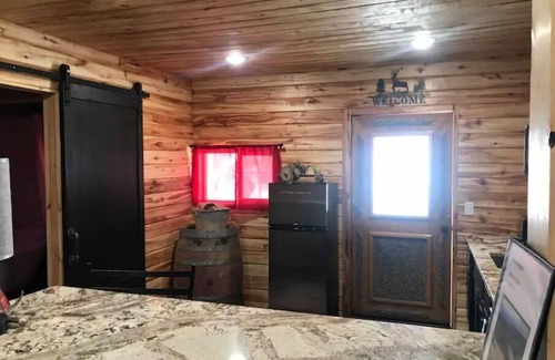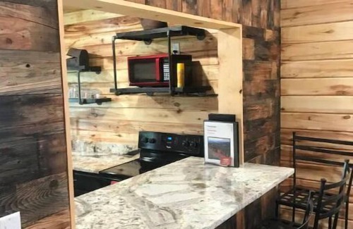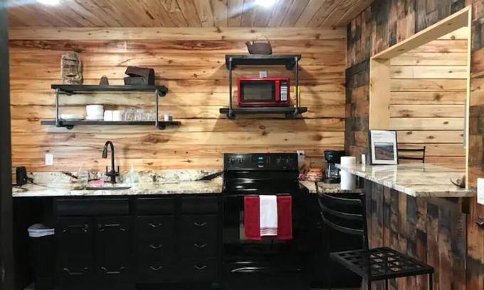 Living room with open bar to kitchen. One bedroom with two queen beds and a big closet with ironing board. Fully equipped kitchen with a fridge, stove, and microwave. Laundry room with washer and dryer. Bathroom with claw foot tub/shower, sink, vanity, and toilet. Warm and cozy cabin/ farmhouse feeling. There is no backyard access. Quiet neighborhood