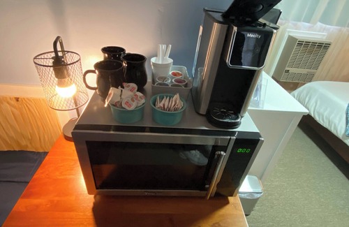 We provide all the essentials for a convenient stay, including a coffee pot and coffee, towels, shampoo, and conditioner. A mini fridge is also at your disposal for added convenience.