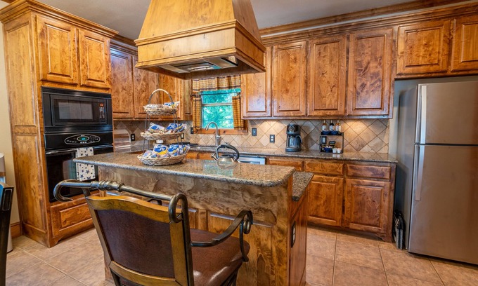 The home is a spacious 4-bedroom 2 ½ bath home with a well equipped kitchen, game room, and large bedrooms. Downstairs includes the game room with bumper pool, foosball and shuffleboard along with games, a big screen TV, and bar height seating so you don’t miss the action. The kitchen is ready for your cooking pleasure with complimentary spices, and utensils as well as a coffee bar that includes k-cups, drip coffee, and tea. The coffee bar includes a starter pack of sugars, creamer and a variety of flavors.The upstairs living area boasts a wet bar, comfy swing chair, big screen TV and an extra large sectional couch with balcony access. All bedrooms are upstairs. The oversized master suite is fit for royalty. The bedroom has a work space, balcony access and a California king bed with the en suite bath boasting a large jacuzzi tub and rain shower head surrounded by beautiful rock arches. We have high speed wifi for guests who would like to work from home.