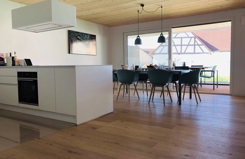 Welcome! We look forward to welcoming you in our modern, elaborately and lovingly furnished apartment. The apartment is located in a middle of 2019 in residential climate friendly Holzständerbauweise completed apartment building with 5 parties and a floor space of approximately 99 sqm in a quiet residential environment in Oberuhldingen, an ideal starting point for all activities on Lake Constance (3min walk to the train connection Überlingen, Friedrichshafen, Lindau) ,
