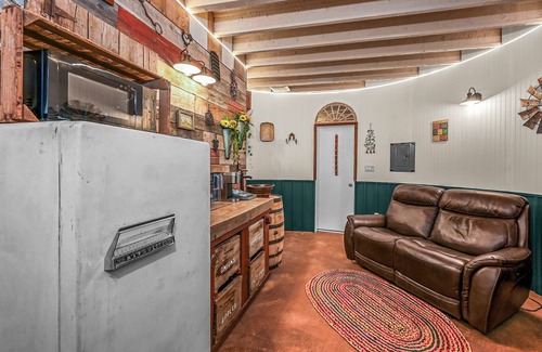 Sleep inside a real converted grain silo on our small Idaho farm. This one-of-a-kind studio features a lofted bedroom with a queen bed, a full bathroom, and a downstairs kitchenette complete with a well-stocked coffee bar for slow mornings or late arrivals.
